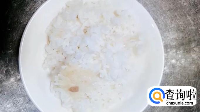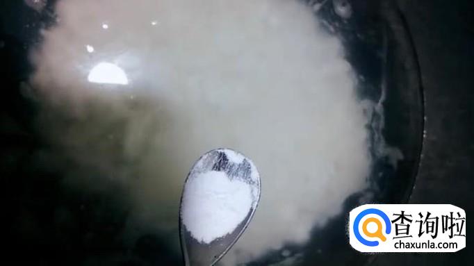 水开后,将准备好的剩米饭倒入水中,再向锅中加入半勺食用面碱,小火加热。