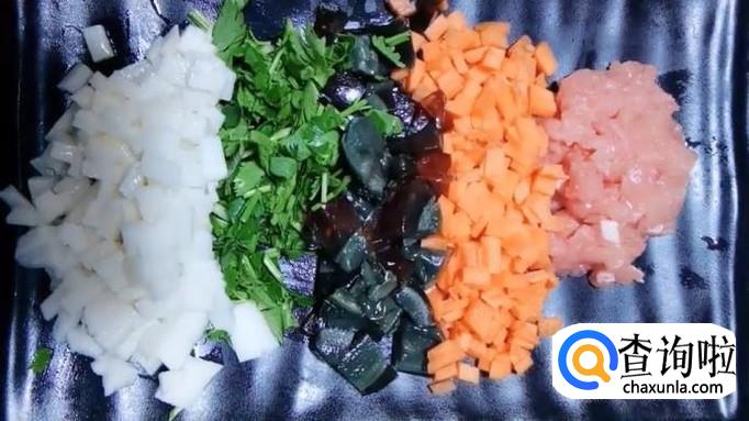 将皮蛋、胡萝卜、山药、香菜切成碎末,与猪肉糜一起放在盘中备用。