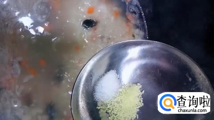 十五分钟后,向锅中加入一勺盐和一勺鸡精,加热搅拌均匀。