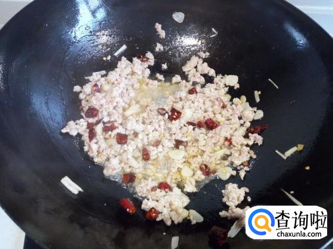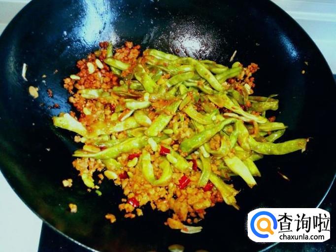 放入肉末小火翻炒,放少许料酒。炒至肉末颜色微白,放入炸好的芸豆,放入少许白糖,盐,转大火翻炒。