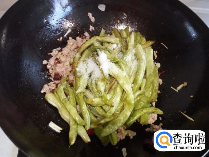 芸豆与肉末,调料一起翻炒均匀,放入酱油,略翻炒一下,放入味精,关火出勺。