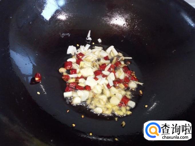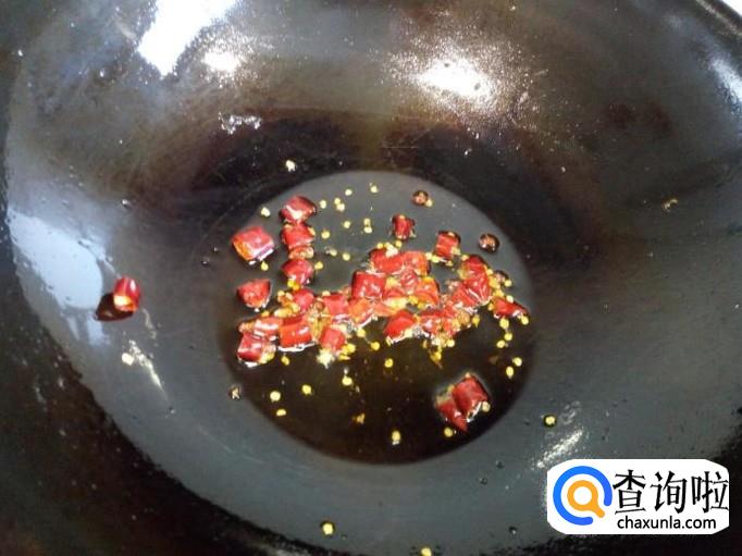 盛出炸芸豆多余的油,锅内留少许油加热,油热后放入花椒,红干椒,葱,姜,蒜,爆香。
