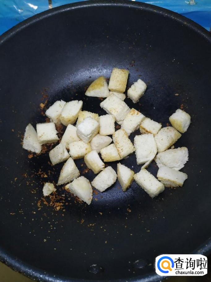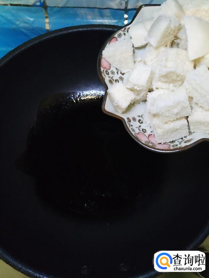 炒锅中放入适量油,油热后,将馒头倒入锅中,炒至表面微微发黄,盛出备用。