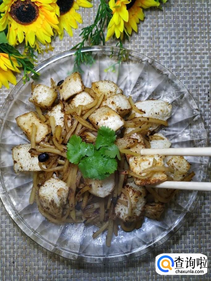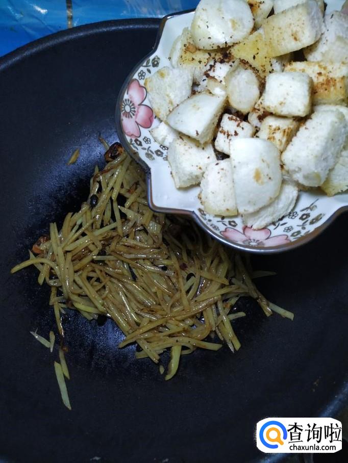 将之前炒好的馒头块儿倒入锅中,和土豆丝一起翻炒均匀。