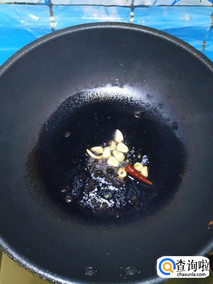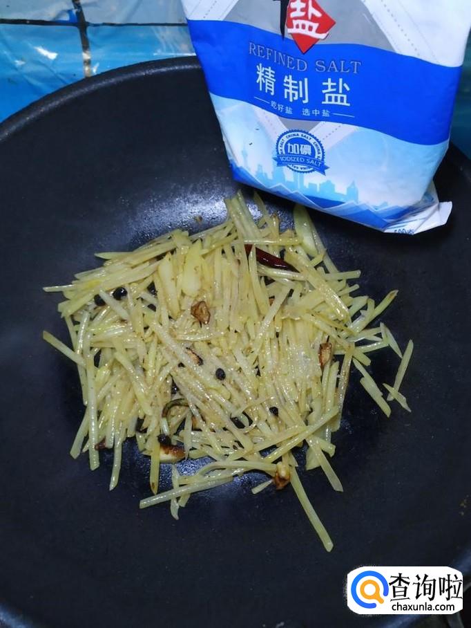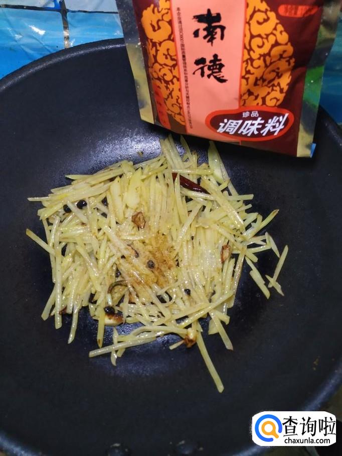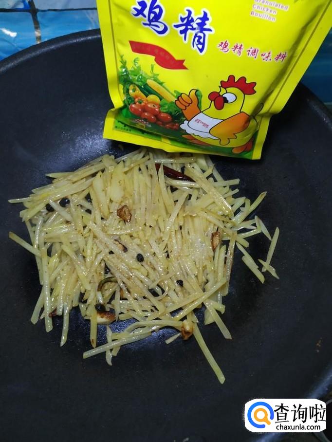 准备适量大蒜,洗净后切成片,炒锅中放入适量油,油热后放入蒜片,豆豉,干辣椒,炒香,然后将土豆丝倒入锅中,翻炒均匀。