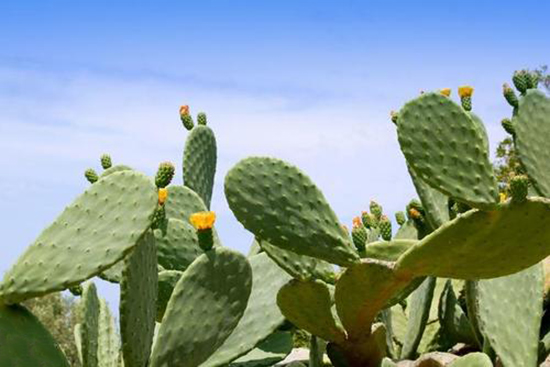 仙人掌外表的最大特点就是长满了刺,但其实这些刺是它的叶子。相较于其他叶片较大的植物,它的针状叶更能保留了植株里的水分,避免因光照和高温加剧蒸腾作用。同时这也是保护自身的利器,减少动物对茎部的伤害。丛生肉质灌木,高1.5-3米。上部分枝宽倒卵形、倒卵状椭圆形或近圆形,绿色至蓝绿色,无毛;刺黄色,有淡褐色横纹,坚硬;倒刺直立。叶钻形,绿色,早落。花辐状;花托倒卵形,基部渐狭,绿色;萼状花被黄色,具绿色中肋;花丝淡黄色;花药黄色;花柱淡黄色;柱头黄白色。
