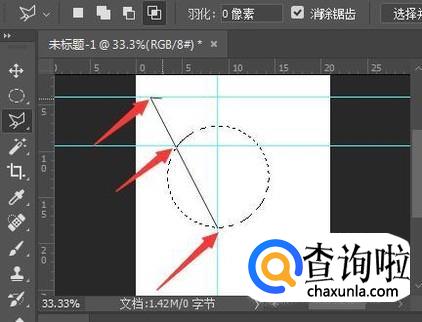 再沿着参考线横过去在适当位置点击,再往底部参考线交叉点处,在未点击前先观察右中部是否对齐第二条横向参考线与圆的交叉处。如果没能对齐则按DEL删除一步重新定位。对齐后则在底部交叉处点击。
