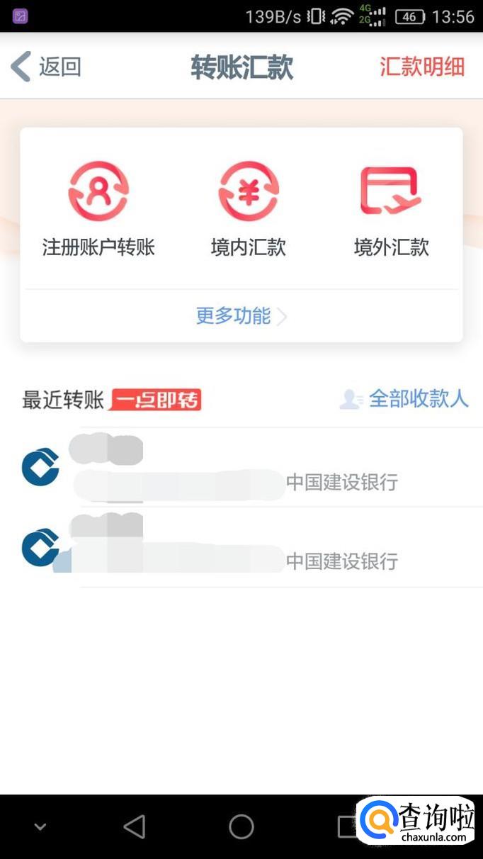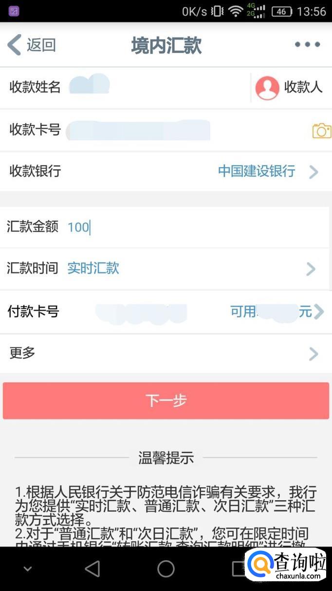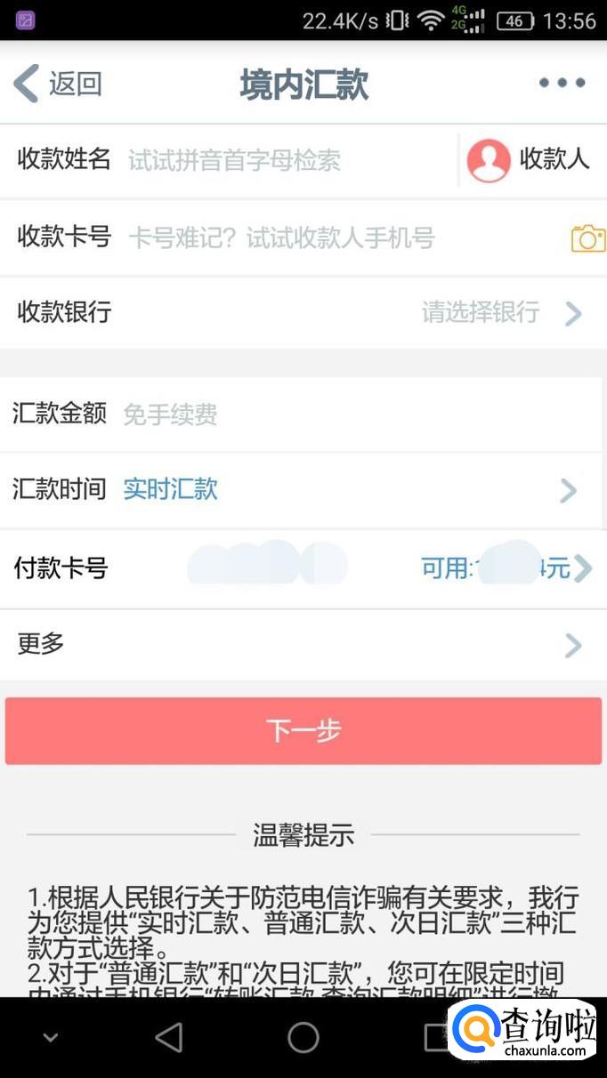 填好收款方的信息及汇款金额。注意:要选择好自己的银行卡(注意卡内的余额够不够汇款的金额)