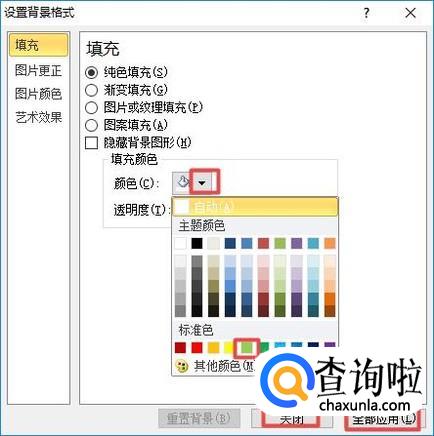 弹出的界面,我们点击颜色边上的下拉箭头,然后我们点击一个颜色,之后我们点击全部应用,然后我们点击关闭;