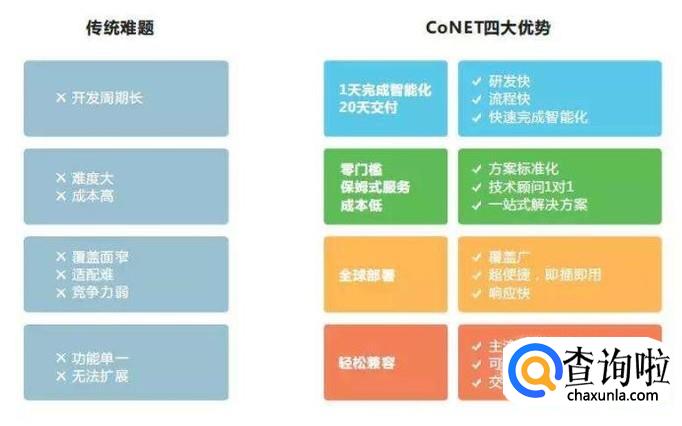 CoNET平台的开发周期也比较短,属于零门槛,并且还是全托管式的保姆服务,成本低,产品方案标准化也高。