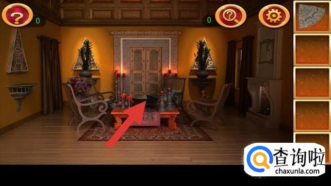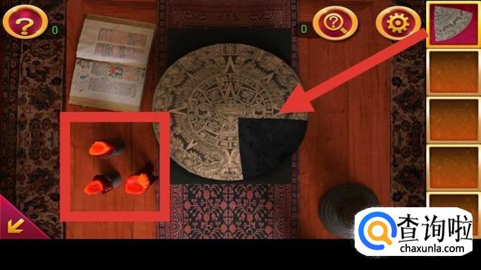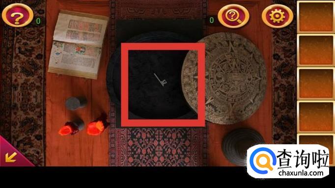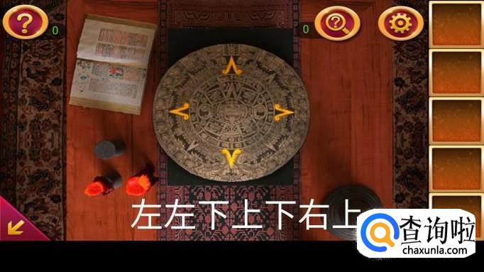 回到中央桌子,在已拼好碎片的圆盘上依次输入提示:左左下上下右上,得到钥匙碎片