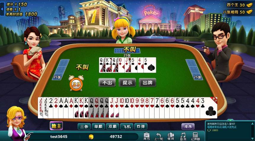 发牌:发牌前需扣底,即由系统随机抽取八张牌做为底牌,反扣在一边,其余的牌发给四家,在确定地主之前玩家不能看底牌。地主确定后,底牌自动加到地主手中。