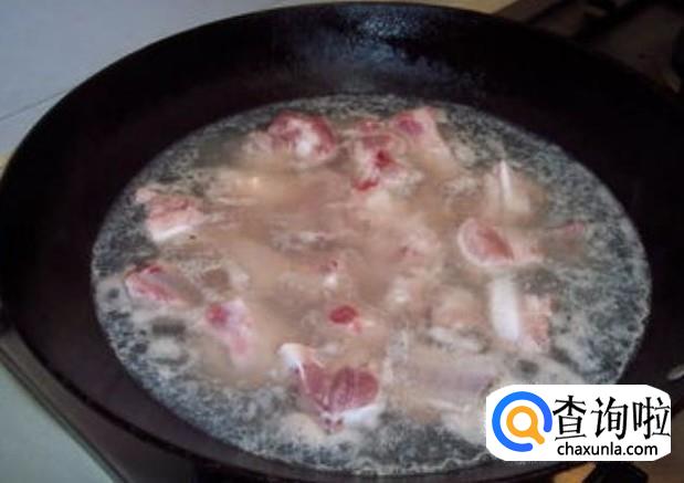然乎把排骨洗净、切块放入锅中去除浮沫,为了去除腥味我们可以加入一些料酒和姜片。