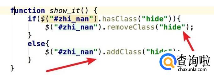 接着用js来实现显示,隐藏的功能。我们用Jquery的hasClass方法来判断div是否有hide样式,有则删除这个样式,即显示div。如果没有,则添加一个hide的样式,即隐藏div。