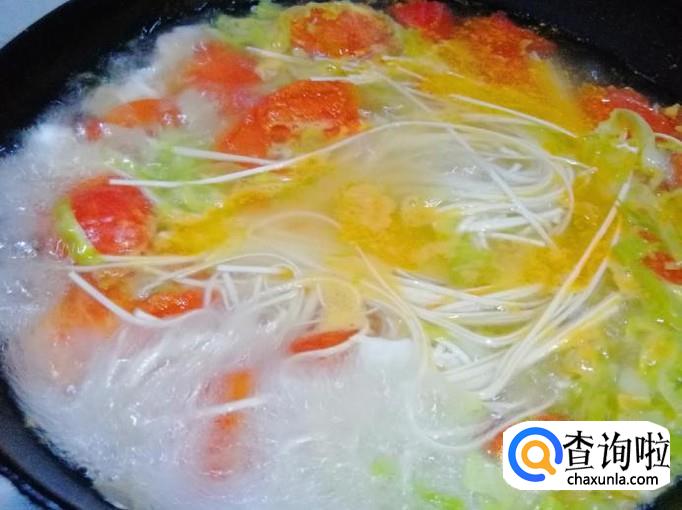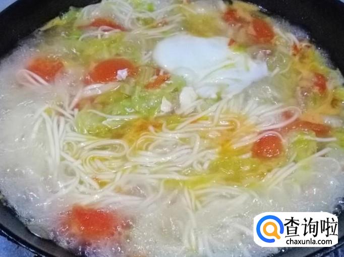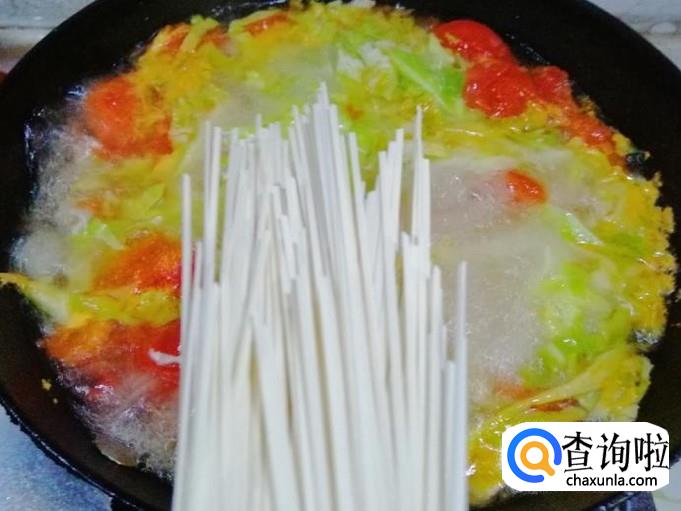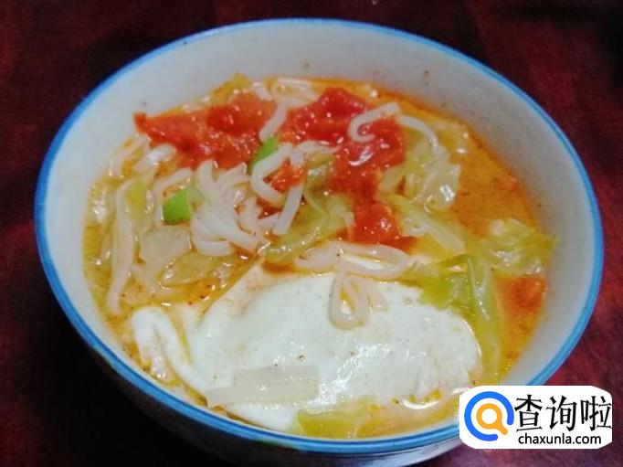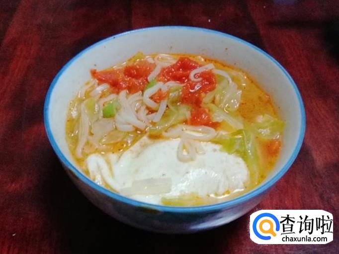 如图所示,包菜西红柿荷包蛋面就做好了,加入适量食盐,根据自己的口味还可以加醋和辣椒油,把煮好的包菜西红柿荷包蛋面,盛入碗中就可以开吃了。