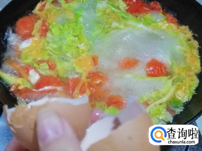 放入包菜叶子后,接着锅中磕入两个鸡蛋,然后锅中放入适量面条,用筷子把面条搅散,大火煮开三分钟左右就可以了。
