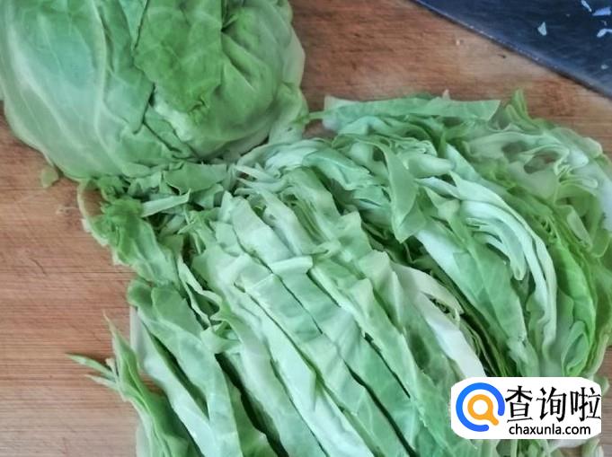 取适量新鲜的包菜叶子,用清水把包菜叶子洗净,然后把包菜叶子切成细丝待用,用量根据自己喜好定。