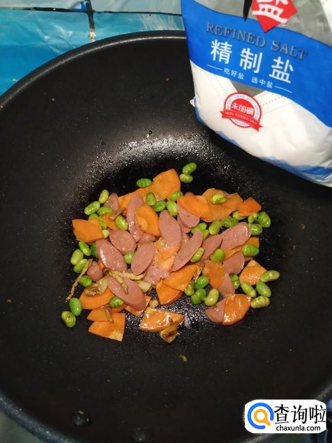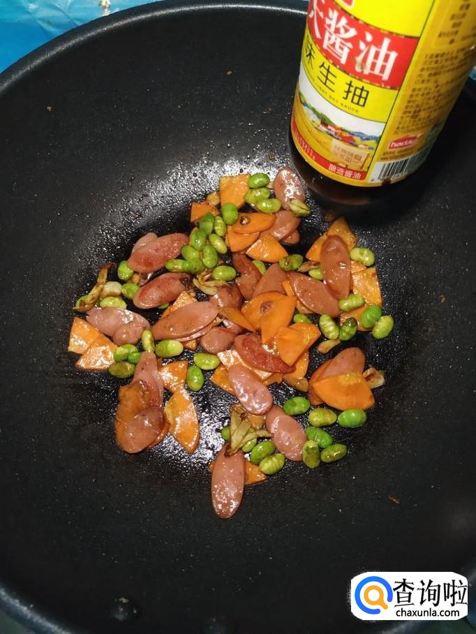 胡萝卜洗净,去皮后切成片儿;再准备适量毛豆,洗净后控干水分;将火腿肠,去除外衣后,也切成片,放入盘中备用。