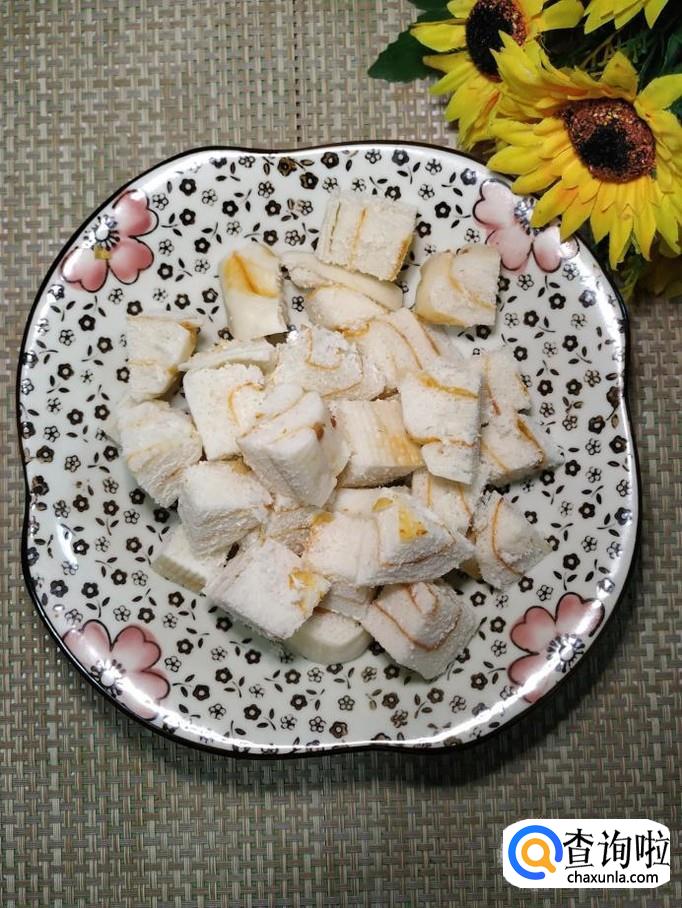 准备适量胡萝卜和一根火腿肠;再准备一个剩馒头,这个是昨天晚上吃剩下的花卷,将花卷切成块,放入盘中备用。