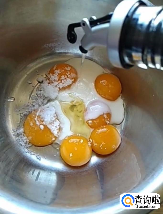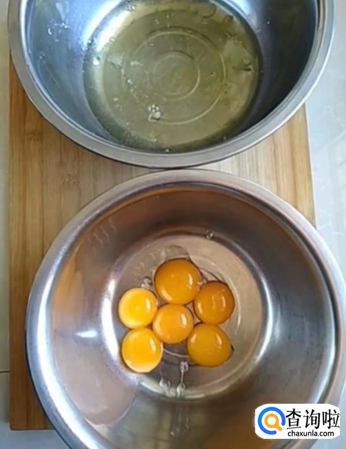 首先我们将六个鸡蛋的蛋清蛋黄分离。分别打入两个盆中备用