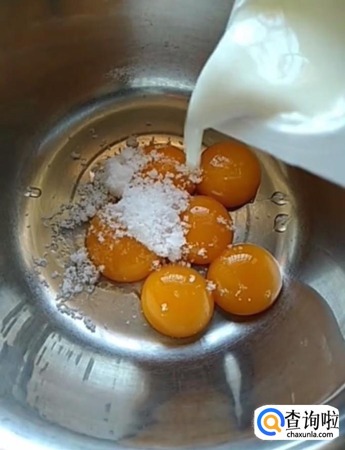 然后我们在蛋黄中加入20g白糖,40g酸奶,40g食用油