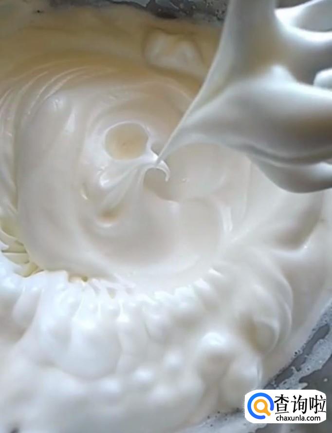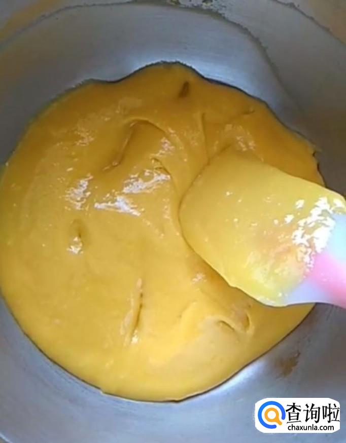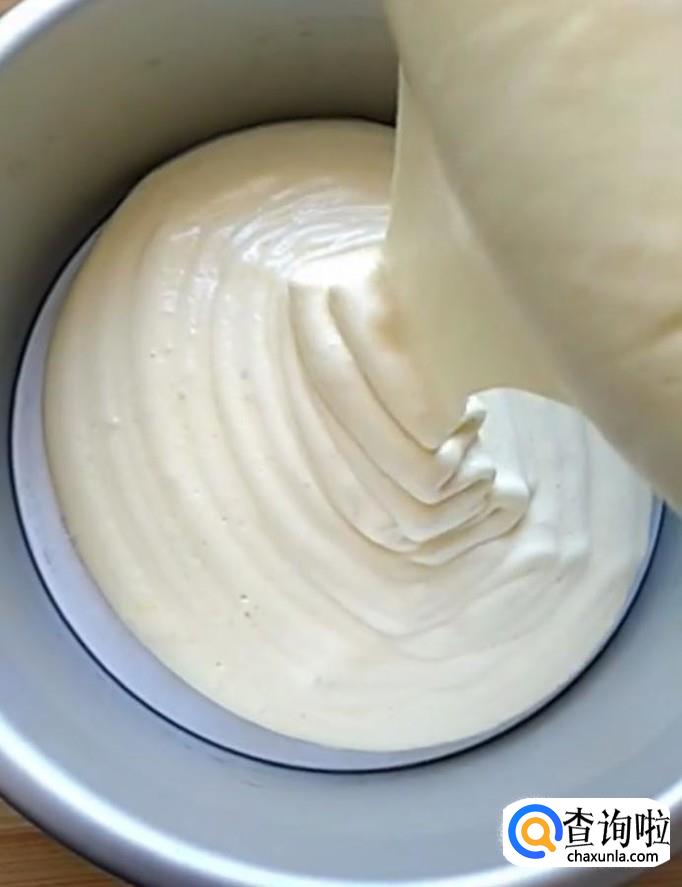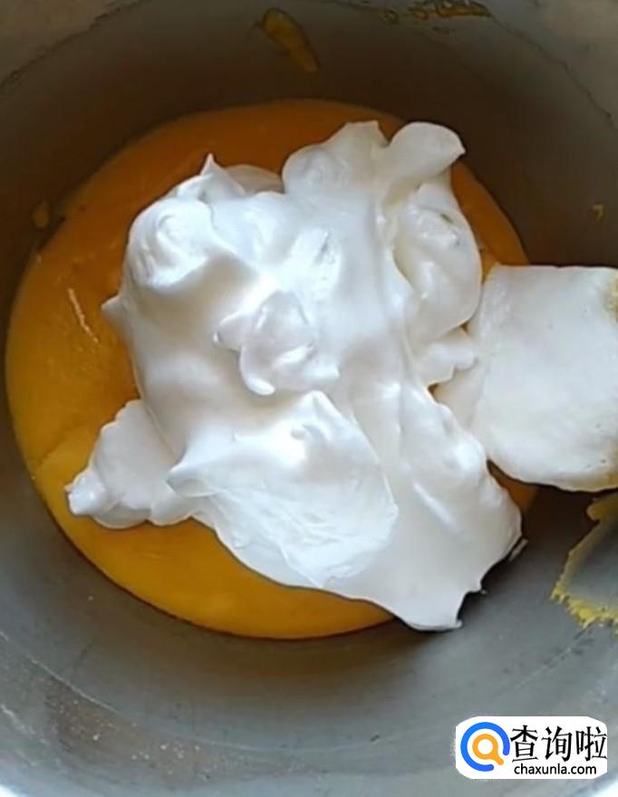 接着我们分三次将蛋清倒入蛋黄糊中,上下翻拌均匀
