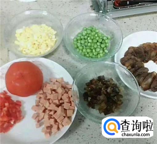 首先,制作网红饭的配料比较丰富,我们需要准备好西红柿、玉米粒、青豆、腊肠和胡萝卜,除西红柿外全部切丁备用。