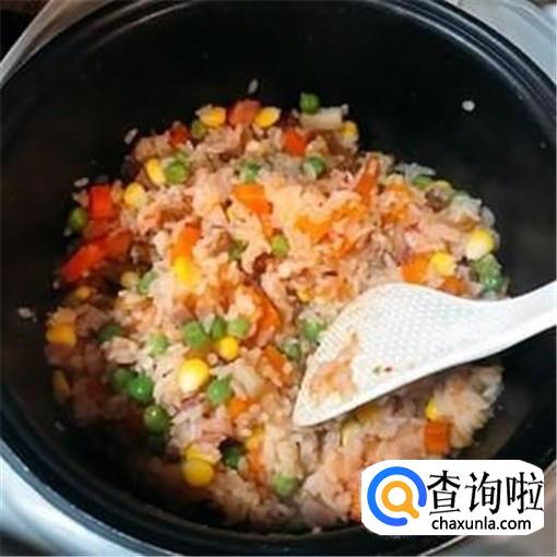 等待半个小时左右,网红饭基本就煮熟了,我们用饭铲将米饭搅拌均匀就可以开始吃了。