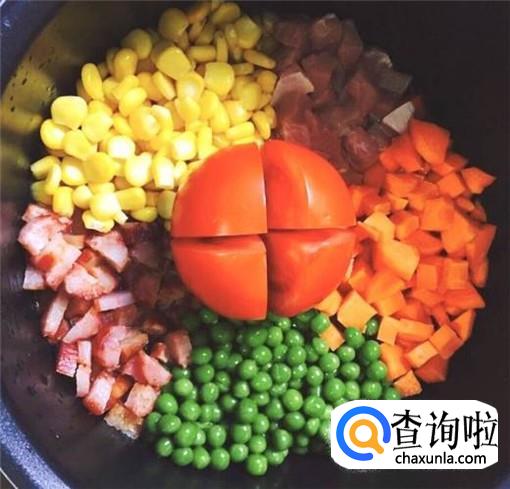 这时候,再把之前准备的各种配料全部均匀的码在生米上面,把西红柿整个放在中间,打开电饭煲的开关。
