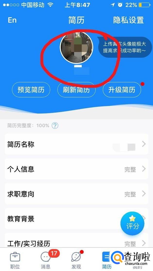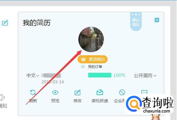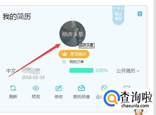 登陆后直接就可以看到我们完整的简历,这里也有一个圆形小图标,就是我们的照片,我们把鼠标放在这个圆形小图标上,可以看到“修改头像”字样,我们用鼠标点击头像,进入修改界面。