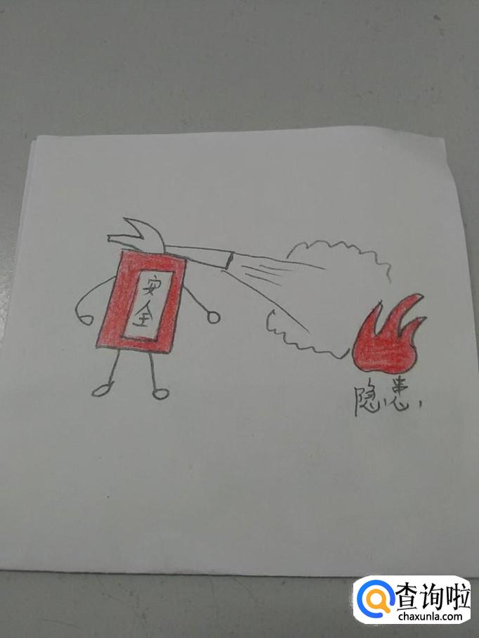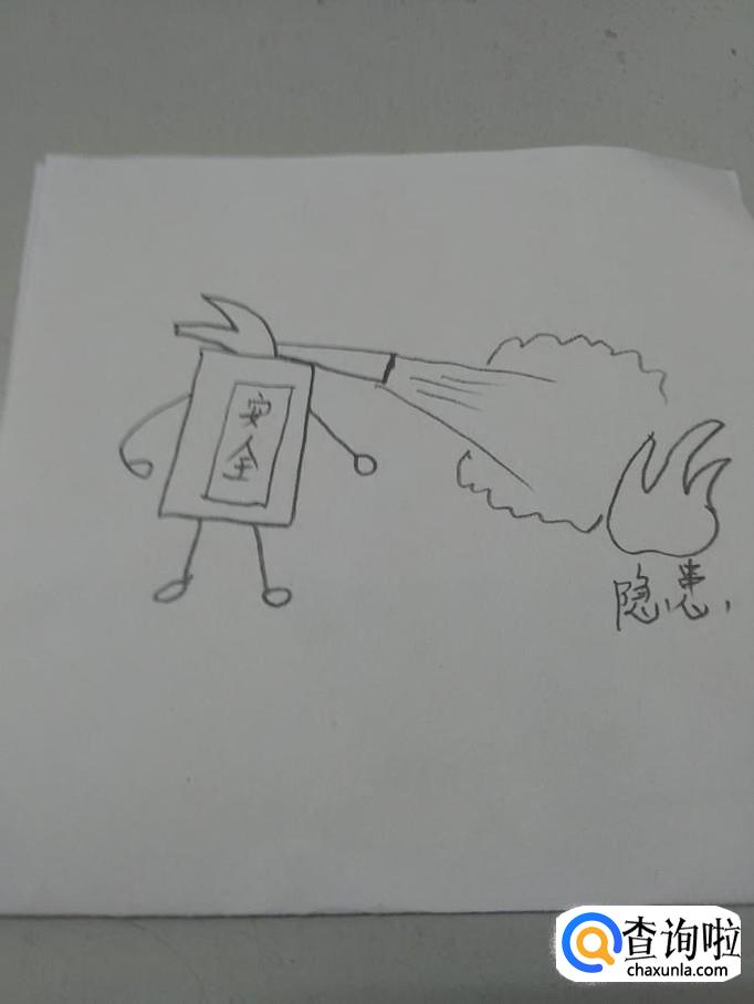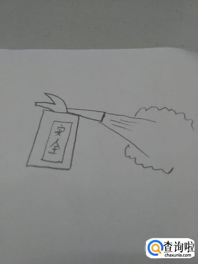 在灭火器中间,画一个长方形,写上安全两字,表示警示牌。
