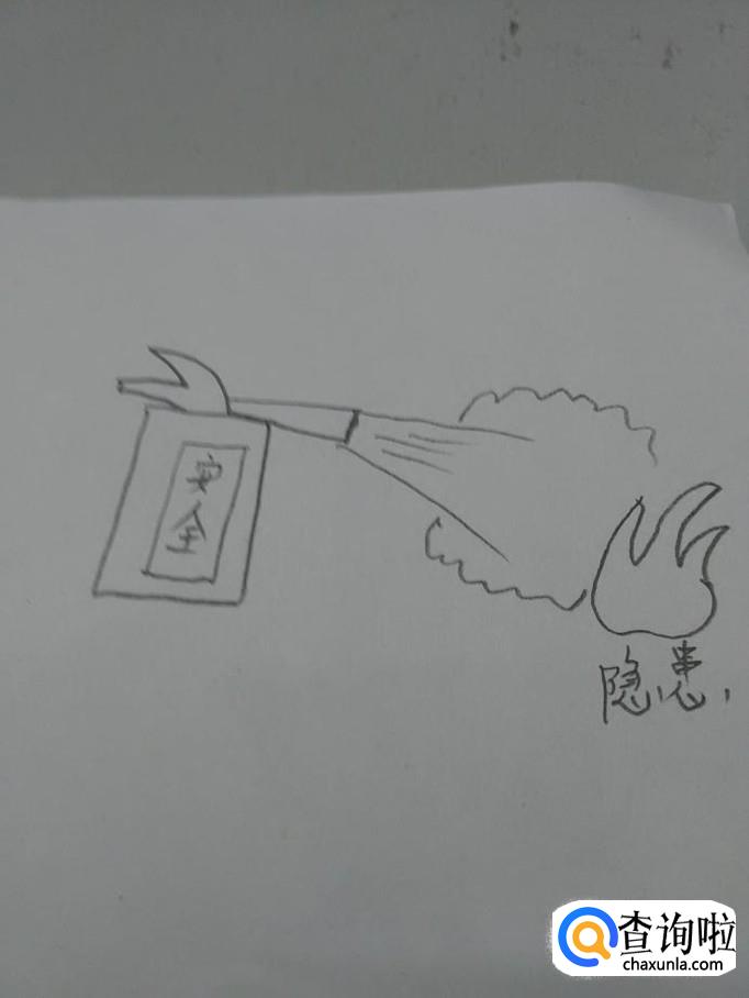在泡沫右侧画一个火苗的形状,在火苗下面写上隐患两个字,表示要把这些安全隐患消灭掉。