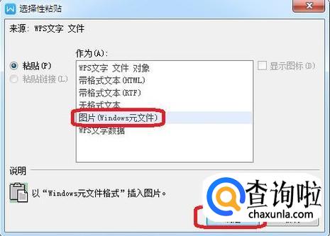 然后选择以“图片(windows元文件)”粘贴,点击确定。