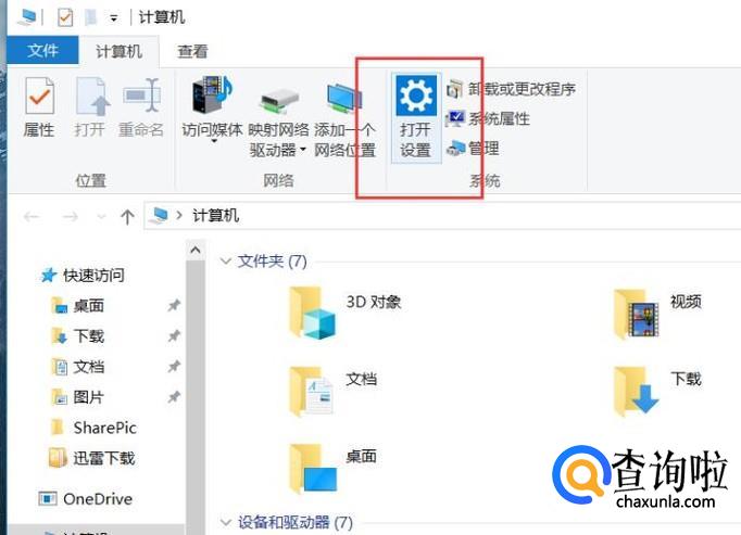 打开Win10系统中的计算机页面,在计算机页面中,点击选择“设置”按钮,打开Windows设置页面。