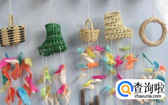每一颗海螺都钻孔和绘制后,用线把海螺以及小珍珠、小贝壳穿在一起,穿的时候,打好的结要留在海螺里面,这样看起来更美观,在海螺之间可以穿插串上小珍珠和小贝壳,形态可以设计成螺旋型、心型等自己喜欢的形状,把每一串海螺都串好之后,挑选自己喜欢的吊顶材料,把每一串海螺的线系在吊顶材料上,吊顶材料可以是一个大海螺,也可以是草编的圈形或其他形态,然后把做好的海螺风铃提起来,就可以装饰我的们屋子了。