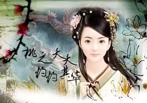 《桃夭》是《诗经·国风·周南》里的一篇,是贺新婚歌,也即送新嫁娘歌。在新婚喜庆的日子里,伴娘送新娘出门,大家簇拥着新娘向新郎家走去,一路唱道:“桃之夭夭,灼灼其华……”红灿灿的桃花比兴新娘的美丽容貌,娶到这样的姑娘,一家子怎不和顺美满呢!果实累累的桃树比喻新娘将会为男家多生贵子(旧观念多子多福),使其一家人丁兴旺。枝叶茂密的桃树比兴新娘子将使一家如枝叶层出,永远昌盛。通篇以红灿灿的桃花、丰满鲜美的桃实、青葱茂盛的桃叶来比对新婚夫妇美好的青春,祝福他们的爱情象桃花般绚丽,桃树般长青。此诗运用迭章、迭句手法,每章结构相同,只更换少数字句,这样反复咏赞,音韵缭绕;优美的乐句与新娘的美貌、爱情的欢乐交融在一起,十分贴切地渲染了新婚的喜庆气氛。