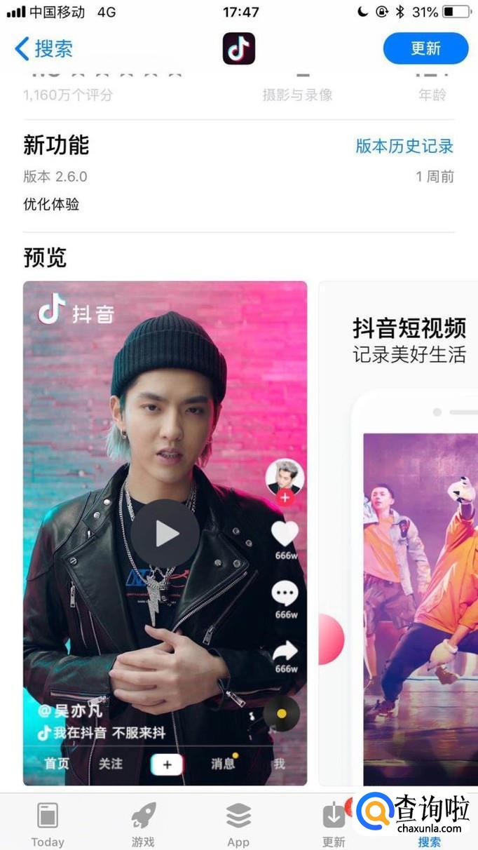 之后我们就可以查看到抖音的最新版本,我们只要点击屏幕右上方的更新就可以把我们的抖音app升级到最新版本了。你学会了吗?赶快动手试一试吧。