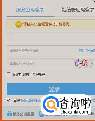 接着输入你的手机号码和服务密码以及验证码并点击登录,如下图所示。