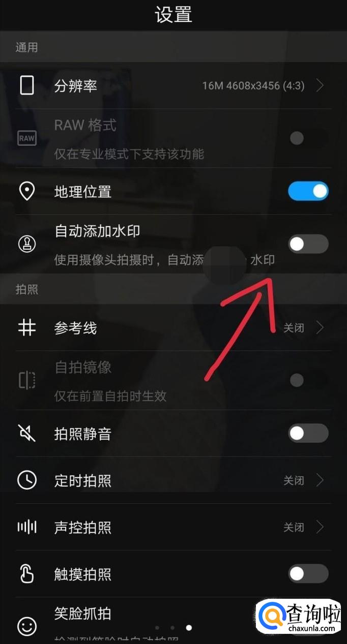 在照相机的界面向左划拉调出摄像设置,勾选自动添加水印,如下图。