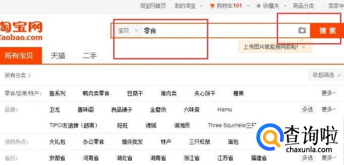 然后搜索想要买的东西的关键词,比如【零食】,如下图所示: