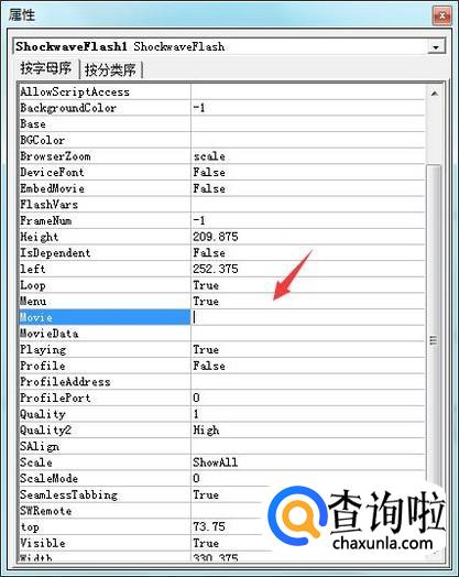点击属性表在弹出的对话框内找到movie选项,在其后输入我们的swf文件名,这样我们就将swf文件插入进来了,如图所示: