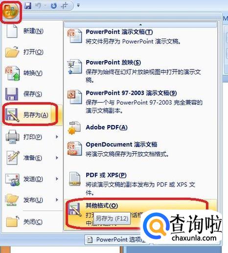 点选任意一张幻灯片后,点击页面左上角“office 按钮”,然后选择“另存为”,扩展菜单中点击“其他格式”。