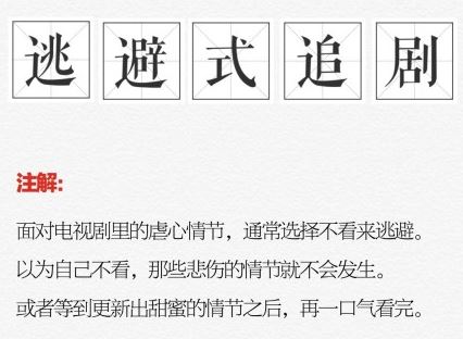 逃避式追剧类似的词,还有军训式追剧,军训式追剧说的是看剧速度赶不上播剧的速度,筋疲力尽,依然不打算放弃追剧。不是我追剧,是剧追我。就像军训的时候一样,整个人保持亢奋和疲惫状态,再苦再累也要坚持把剧追完。