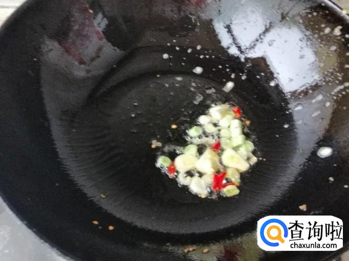 准备炝锅用的调味品。先把大葱用清水洗净,切成葱花待用,喜欢蒜瓣可以多加几个蒜瓣,干红辣椒洗净切好待用。