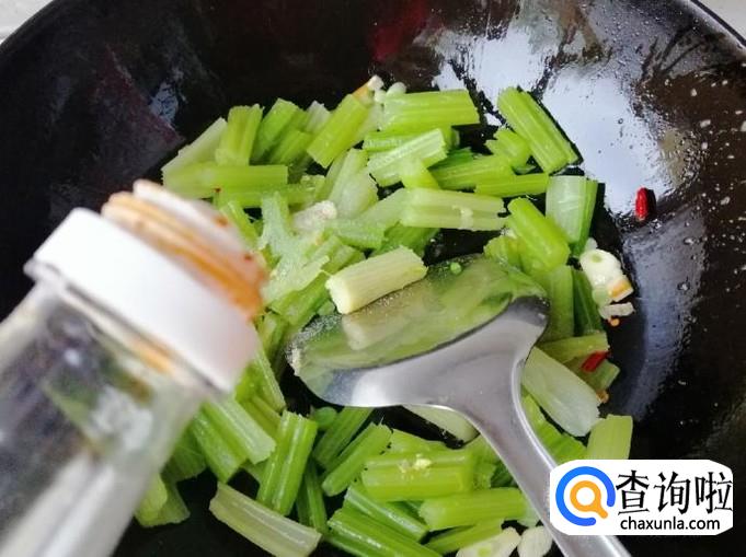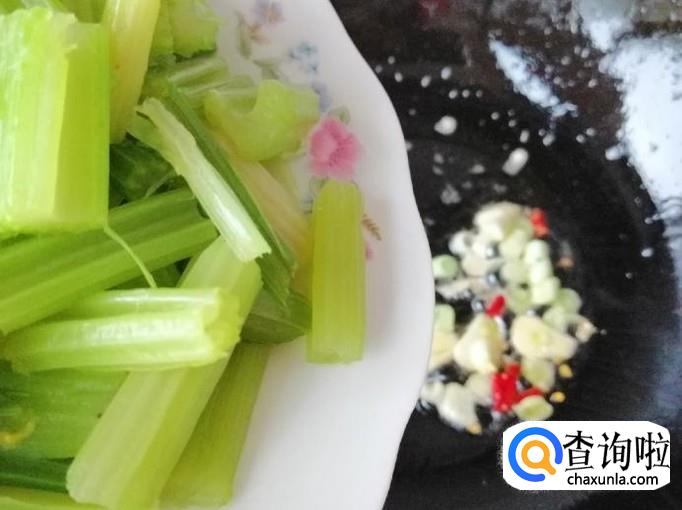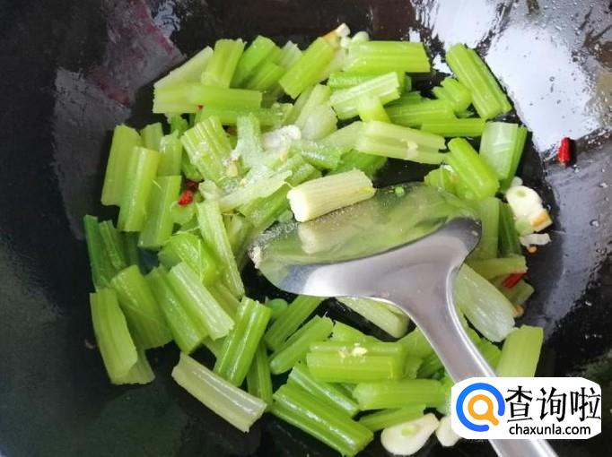 炒锅放少许油,油热后放入备好的调味品,炒出香味后放入备好的芹菜段,芹菜是已经烫熟的,所以放进去稍微翻炒片刻就可以。