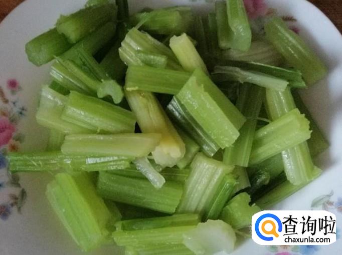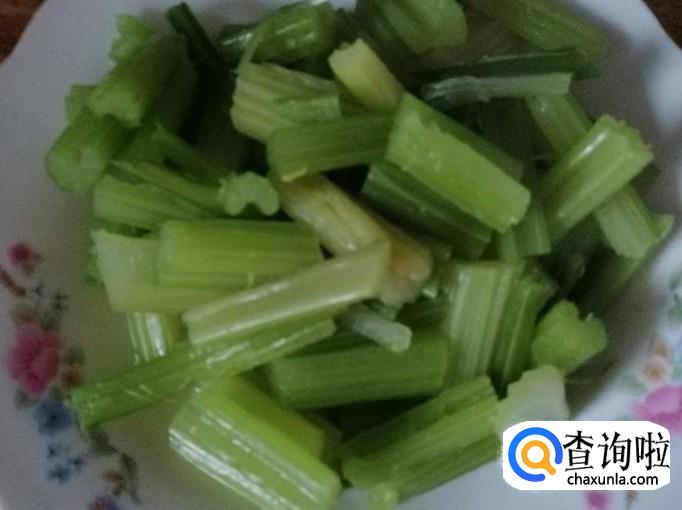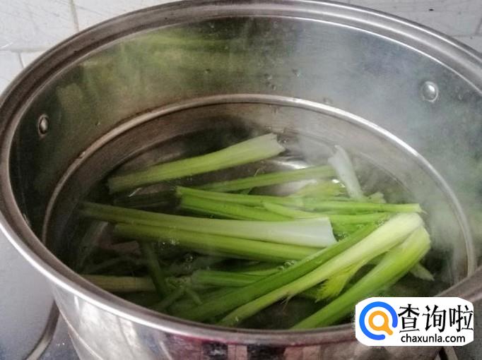 煮锅烧水,水开后放入洗好的芹菜,煮3分钟左右,今天买的芹菜比较嫩,一会就烫好了,捞出芹菜放凉,切成芹菜段待用。