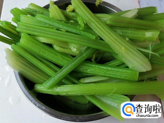 先把买来的芹菜摘掉叶子,然后把芹菜折成段抽掉芹菜丝,放入洗菜盆中,用清水冲洗干净待用。