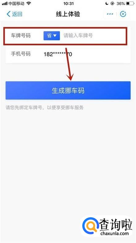 接着输入你的车牌号码并点击生成挪车码,如下图所示。