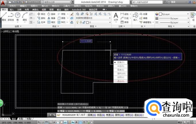 如图所示,命令窗口显示"MEASUREGEOM 指定下一个点或[圆弧(A)长度(L)放弃(U)总计(T)]"。依次拾取测量对象的下一个点,鼠标左键确认。