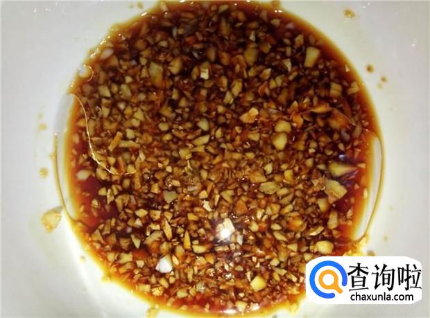 做配料,用适量的姜和两瓣蒜头剁碎,加入适量的花生油和酱油,搅拌均匀即可。